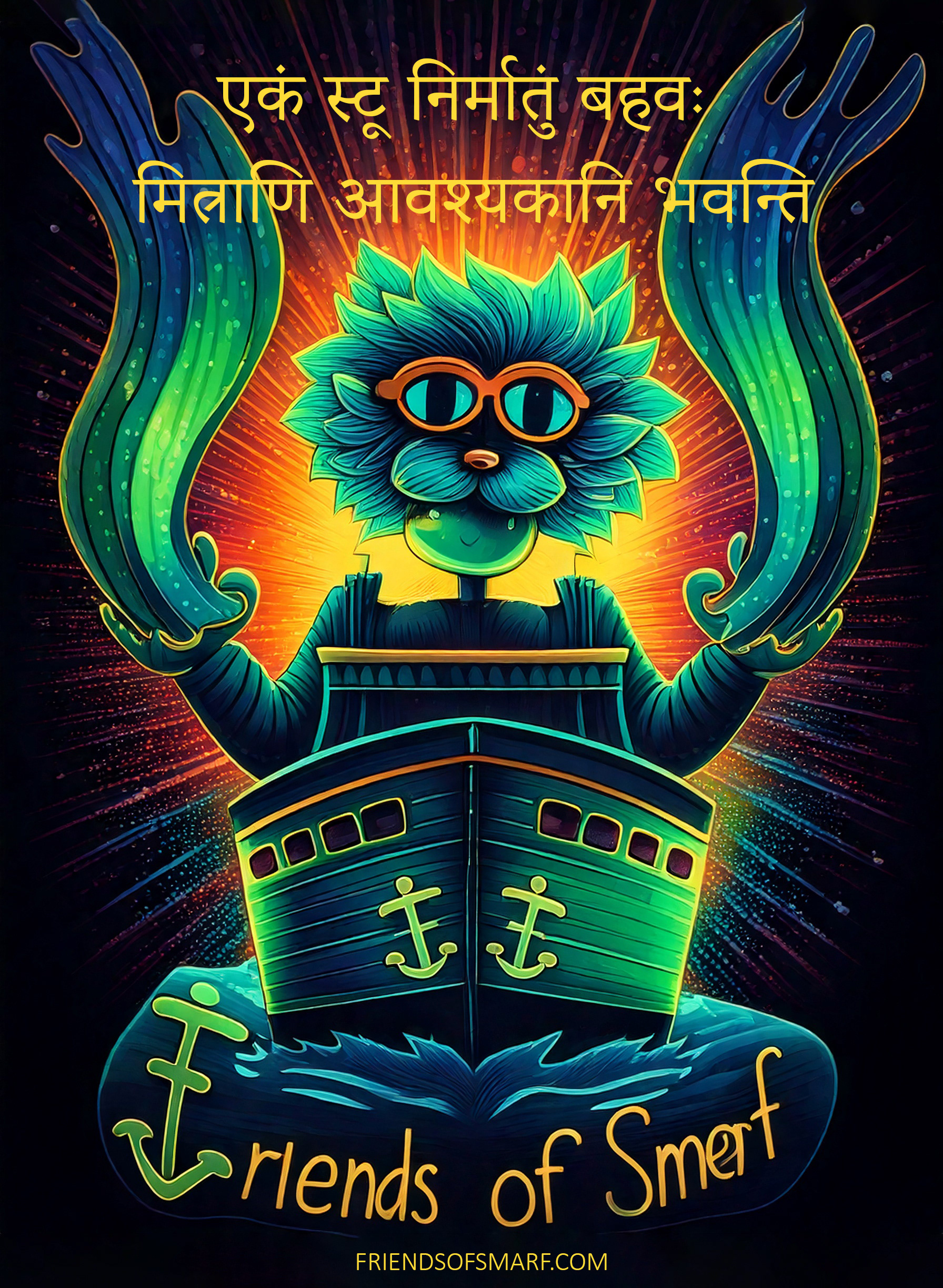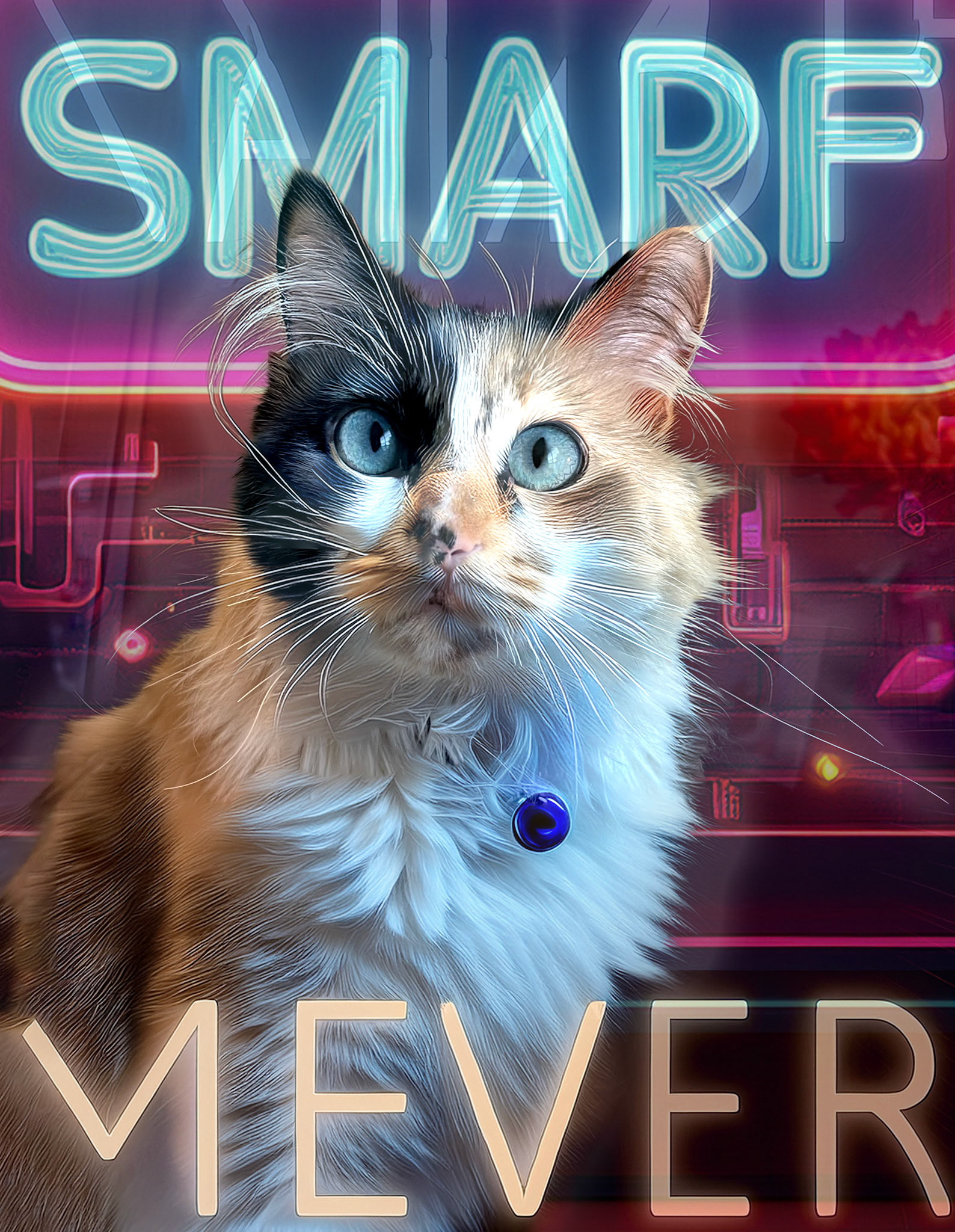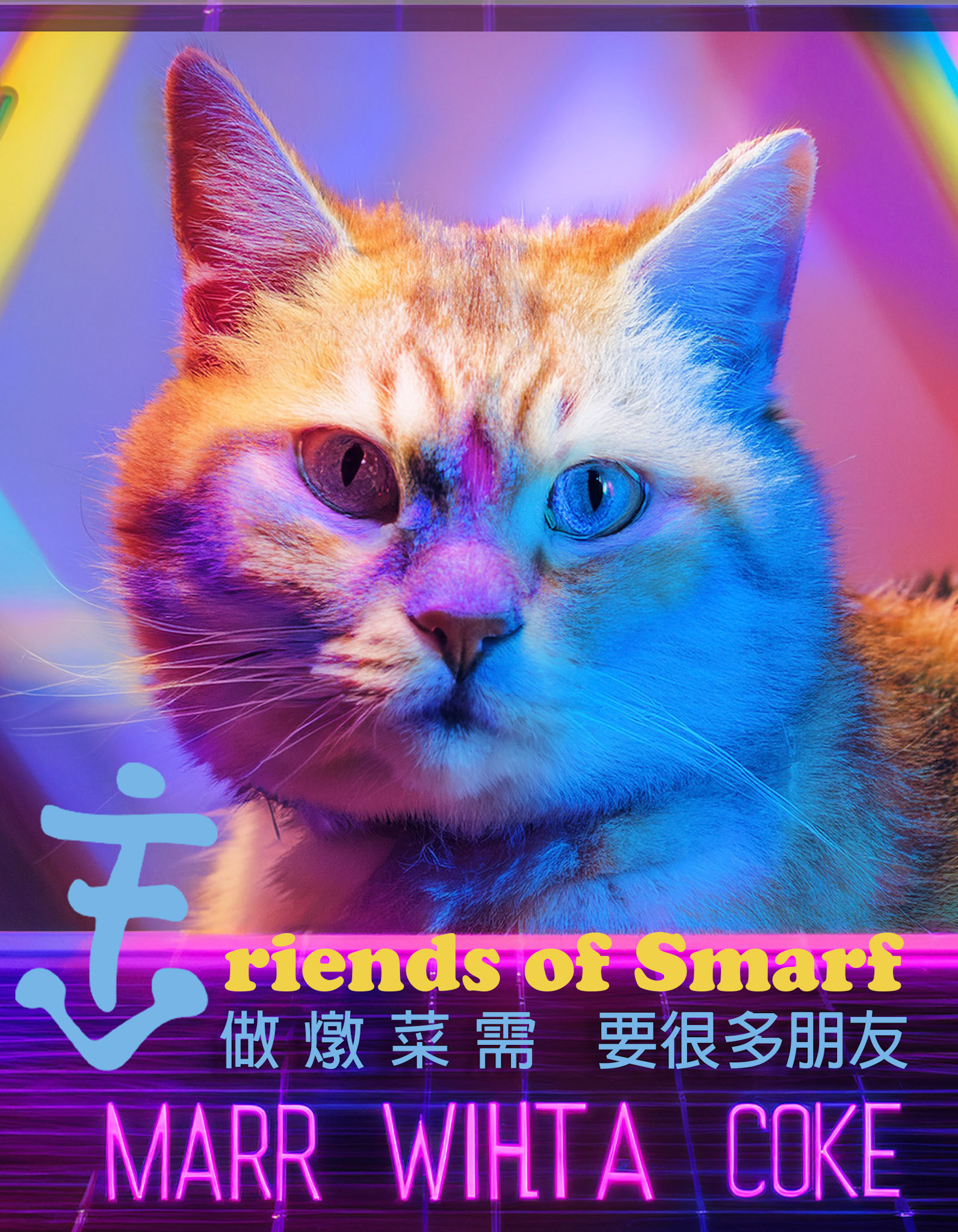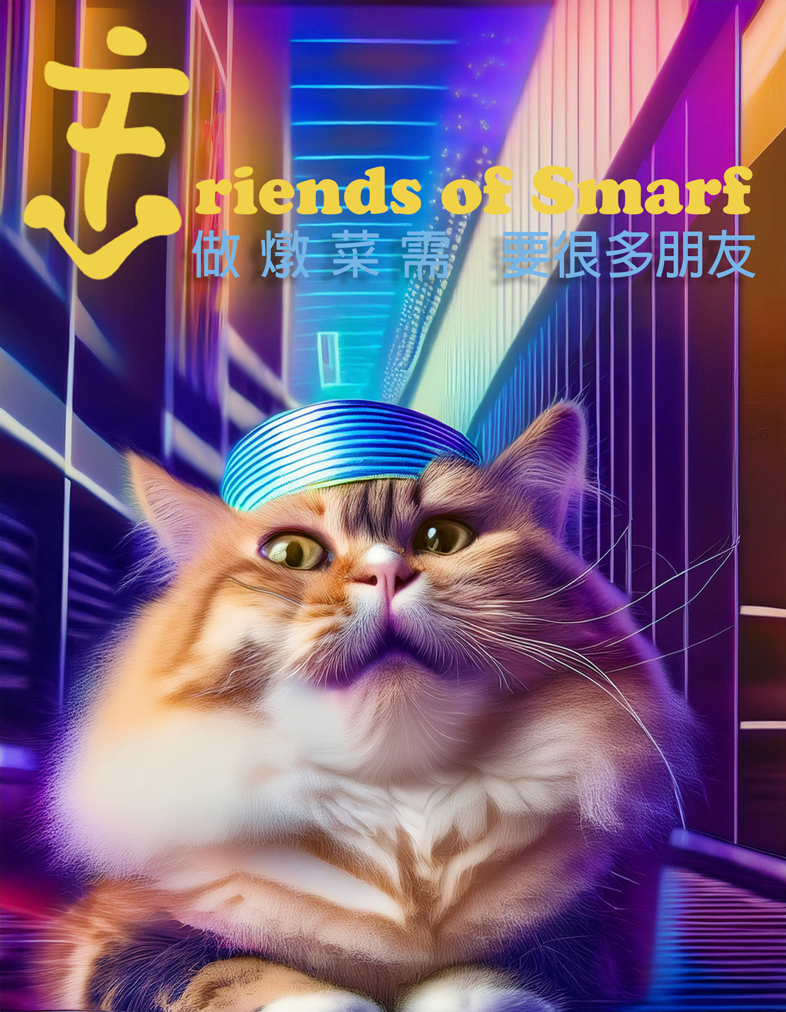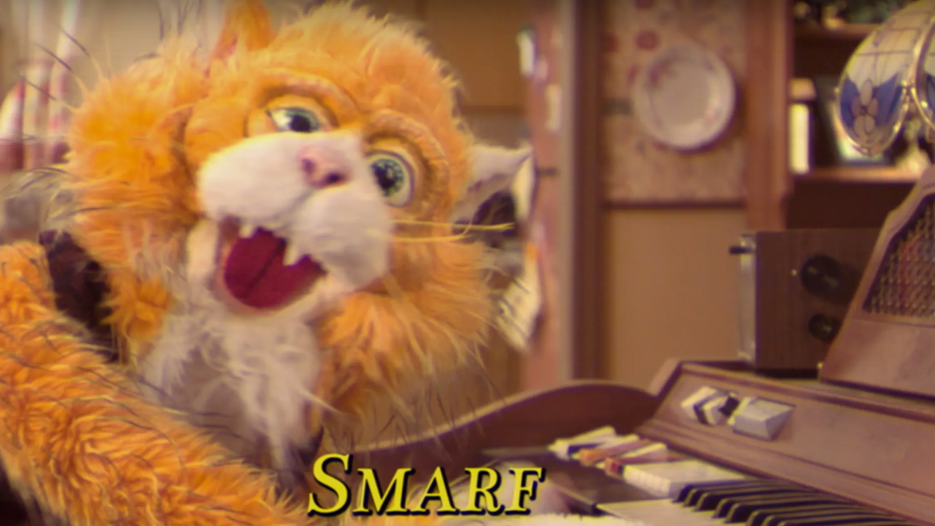Smarf first appears in the sitcom intro of Too Many Cooks, as the family's cat puppet, where he's seen playing the piano. At a certain point, after Bill begins murdering members of the Cook family with a machete and taking their places in the video, he is destroyed when he is shot with laser beams by Smarf, who blows up shortly after, revealing himself to be a robot.